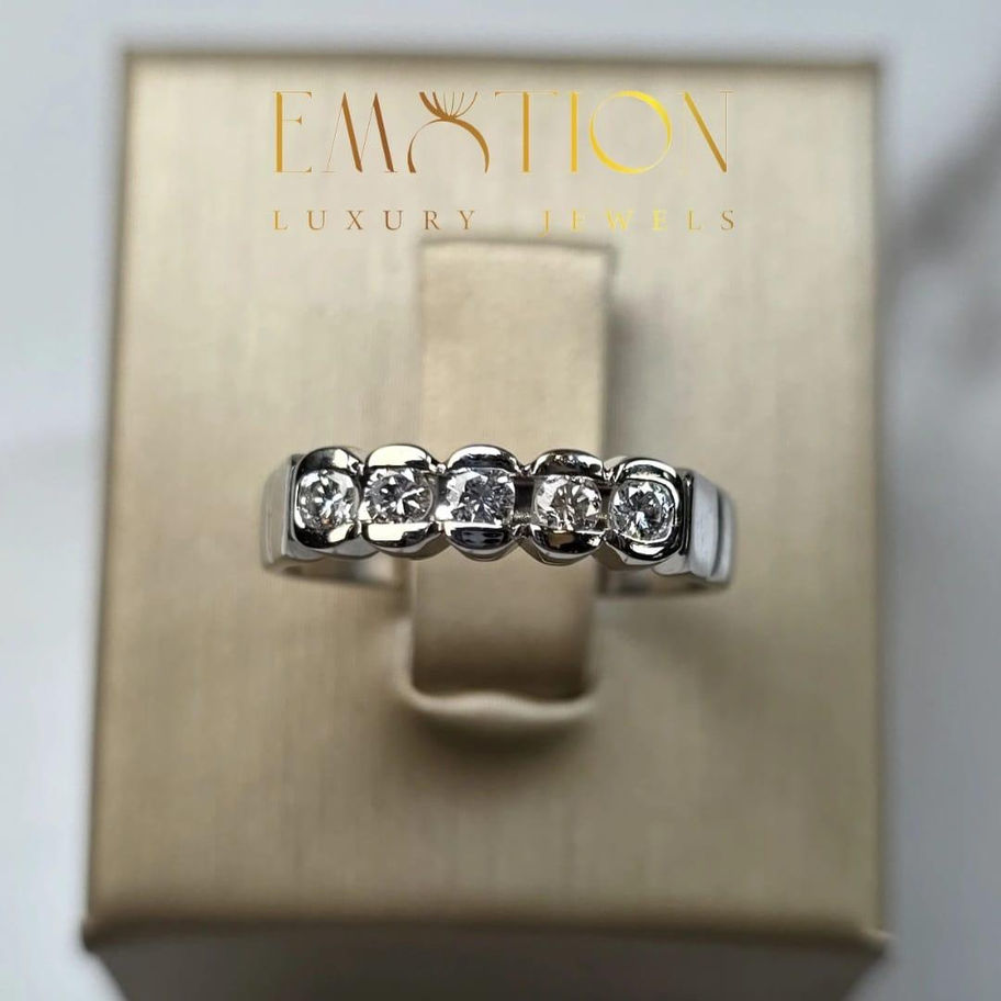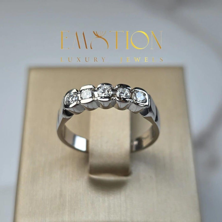 Elegante anello veretta a cinque pietre realizzato in oro 750 (18 carati), impreziosito da diamanti taglio brillante che donano al gioiello luminosità e raffinatezza. La disposizione armoniosa delle pietre crea un perfetto equilibrio tra eleganza classica e brillantezza, rendendolo ideale per ogni occasione.